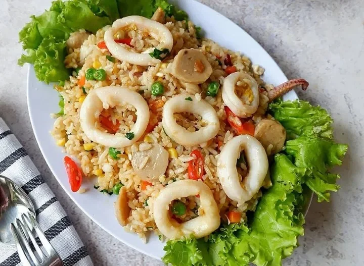 Hidangan lezat yang memadukan nasi goreng berbumbu gurih dengan cumi hotplate yang segar dan empuk. Nasi goreng dimasak dengan rempah pilihan sehingga menghasilkan aroma harum dan rasa yang seimbang. Disajikan bersama cumi yang dimarinasi bumbu spesial, lalu dimasak di atas hotplate sehingga menghadirkan sensasi panas mengepul dan cita rasa yang lebih kaya.
