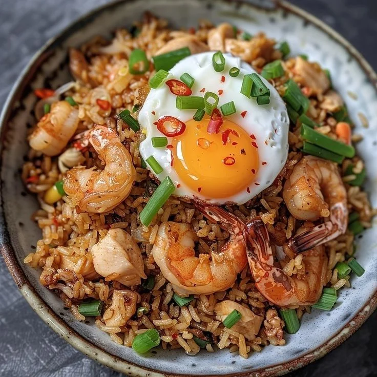 Hidangan lezat yang memadukan nasi goreng gurih dan harum dengan udang hotplate yang disajikan panas mengepul. Nasi goreng dimasak dengan bumbu pilihan hingga menghasilkan rasa yang seimbang, sementara udang segar dimarinasi lalu ditumis di atas hotplate bersama saus gurih-pedas yang kaya aroma.